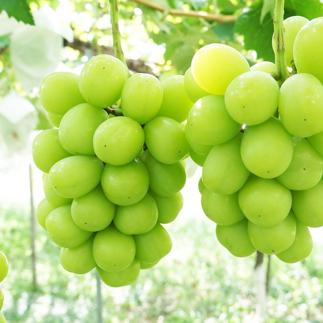 シャインマスカットは種なしで皮ごと食べられる緑色ぶどうで、大粒で果肉がぎっしり詰まっていることが当園ぶどうの特徴です。