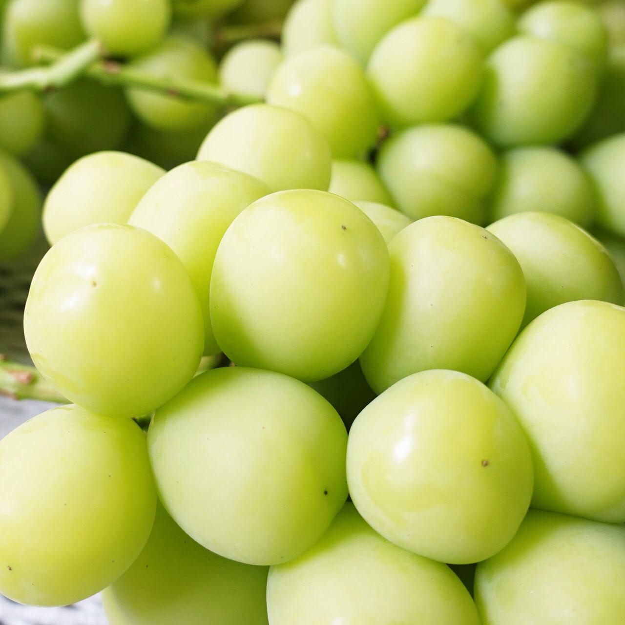 シャインマスカットは種なしで皮ごと食べられる緑色ぶどうで、大粒で果肉がぎっしり詰まっていることが当園ぶどうの特徴です。